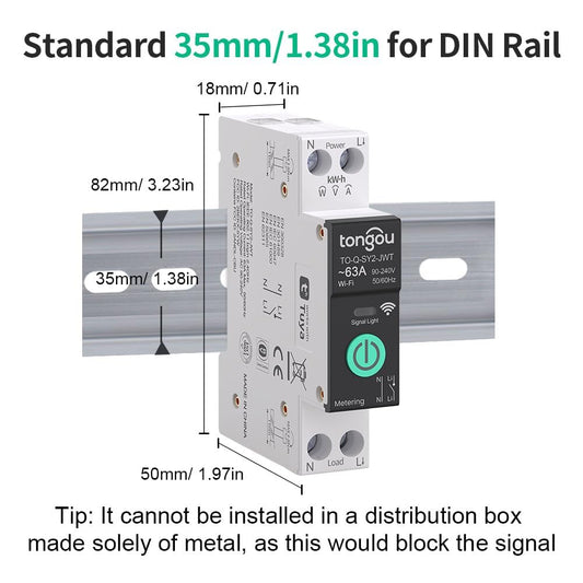 TONGOU SY2 63A Smart WiFi Relay Switch | DIN Rail Mount | Power Monitoring | TUYA App | Alexa & Google Home Compatible | No Hub Required