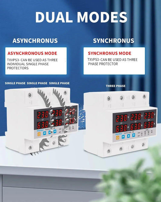 Taxnele 100A 3-Phase Voltage & Current Protector | SYNC/ASYNC Modes | Surge, Overload, Phase Loss Protection | Adjustable Over/Under Voltage & Overcurrent.