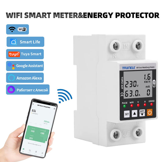Taxnele Smart Wi-Fi Energy Meter 63A | Voltage, Current, Earth Leakage Protection | Smart Life App.