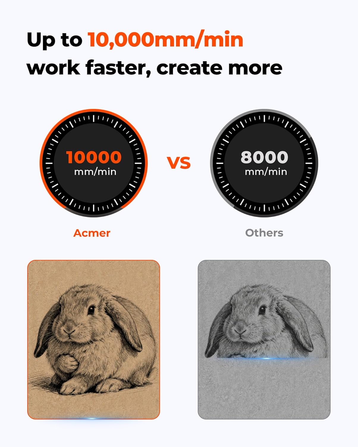 The ACMER S1 Laser Engraver Machine is a compact yet powerful 6000mW diode laser engraver and cutter designed for DIY projects, crafts, and small businesses. With its 0.04mm ultra-fine laser spot, 10,000mm/min engraving speed, and 0.01mm repeatable accuracy, it delivers professional-grade results on a wide range of materials.